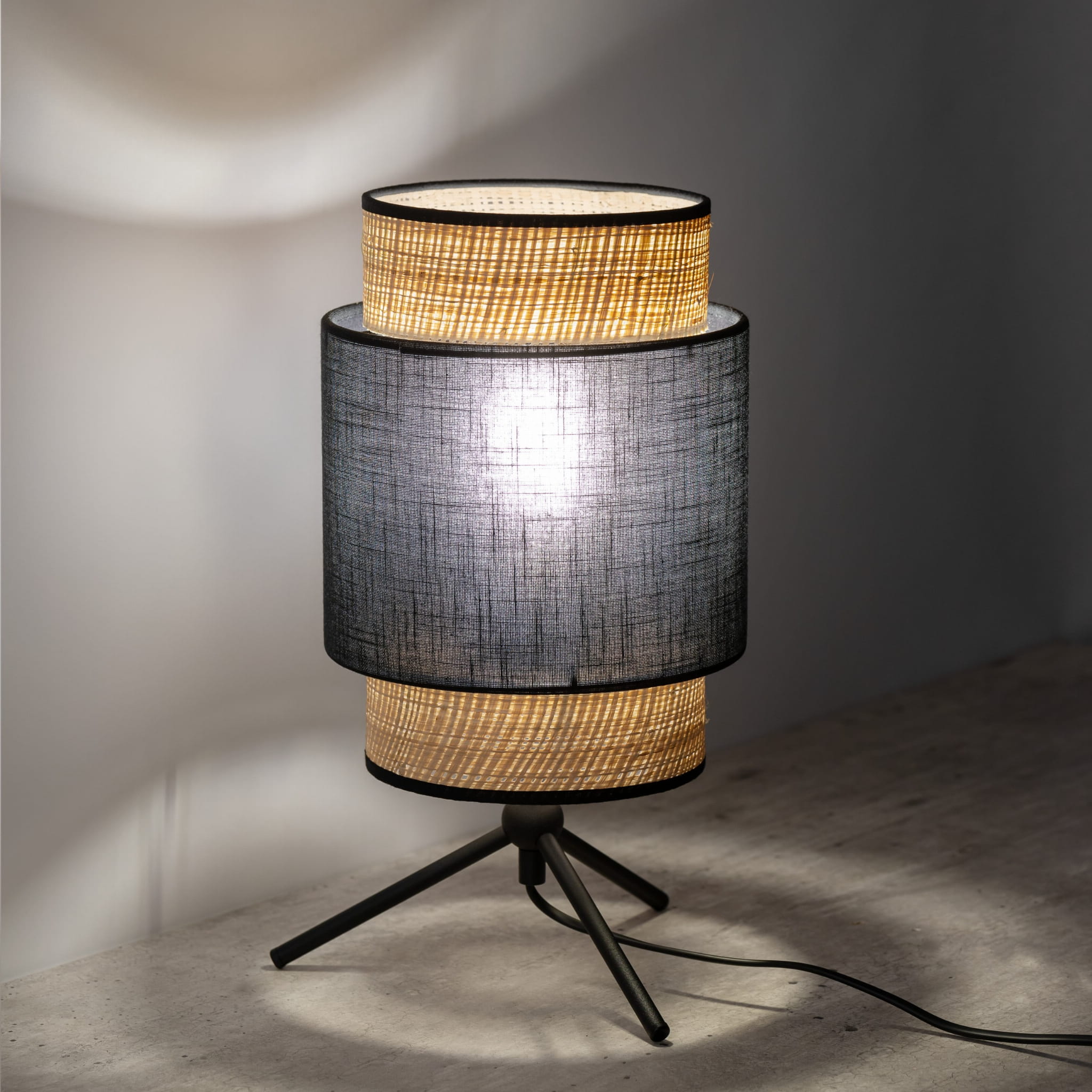 Lampka nocna wykonana jest z metalu z dodatkowymi elementami z tworzywa, co zapewnia solidność oraz elegancję. Klosz wykonany z tkaniny i rafi w kolorze czarnym ze słomkowym wykończeniem nadaje jej boho-stylowy i naturalny wygląd, który doskonale komponuje się z różnymi aranżacjami wnętrz.